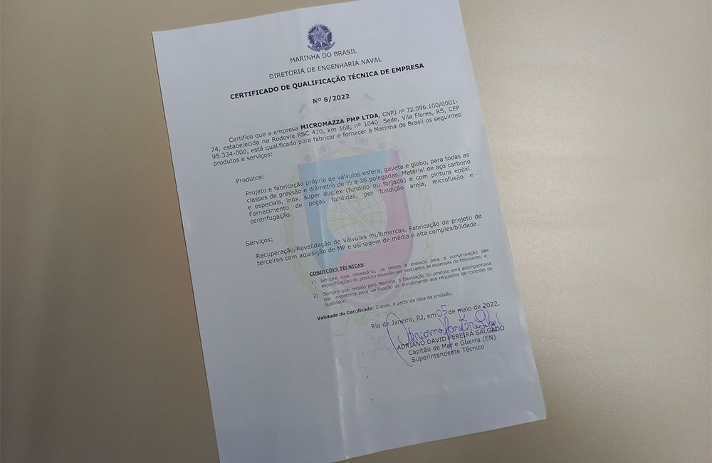 Reconhecida pela sua performance a excelência no fornecimento de seus produtos e serviços, em maio de 2022 a Micromazza recebeu da Marinha do Brasil o CERTIFICADO DE QUALIFICAÇÃO TÉCNICA DE EMPRESA, que a qualifica para o fornecimento de válvulas esfera, gaveta e globo, peças fundidas e recuperação/revalidação de válvulas multimarcas.