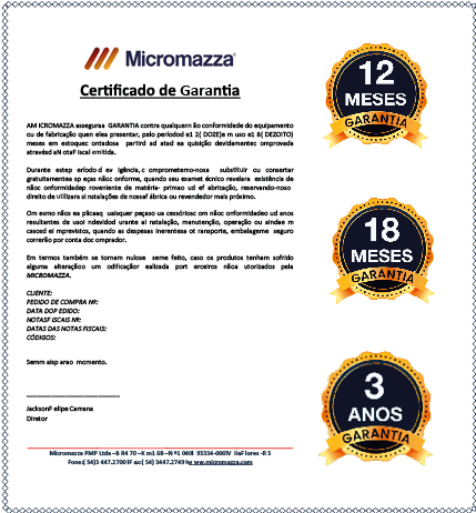 A Micromazza assegura a garantia contra qualquer não conformidade do equipamento ou de fabricação que nele apresentar, pelo período de 12 (DOZE) em uso e 18 (DEZOITO) meses em estoque contados a partir da data de aquisição devidamente comprovada através da Nota Fiscal emitida.