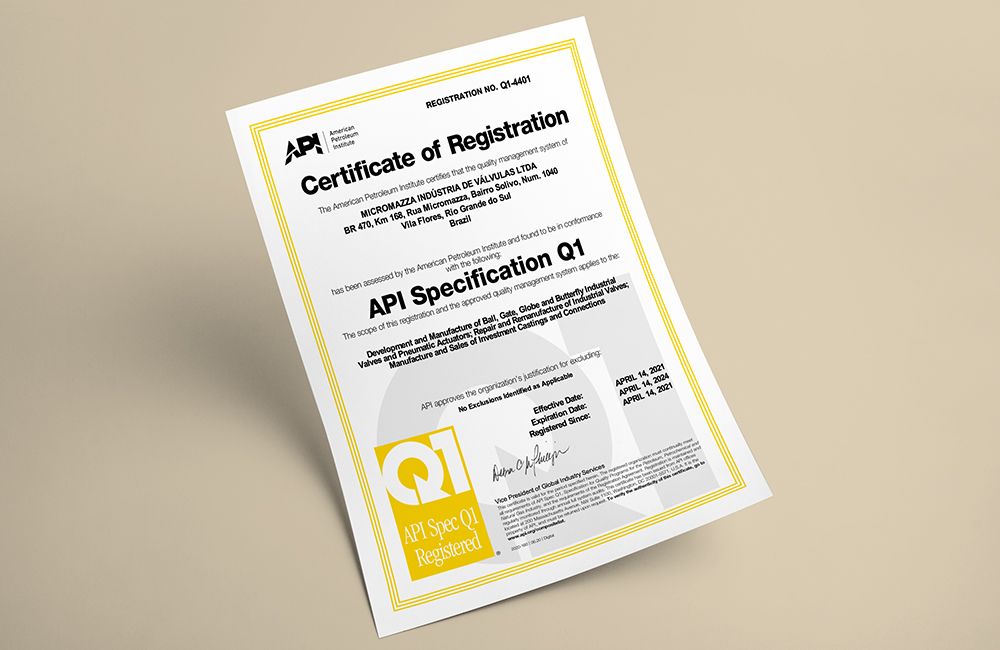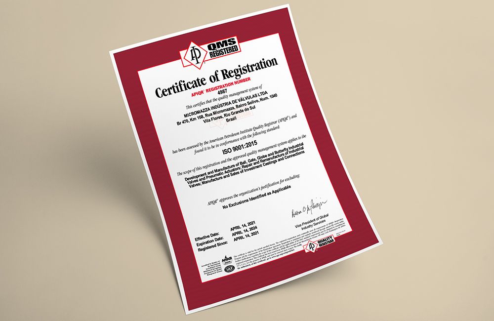As certificações com a API iniciaram em 21 de novembro de 2005, onde a Micromazza estabeleceu um sistema de acordo com norma API Spec Q1, certificando sua linha de produtos de válvula esfera de acordo com Monogram Licencing 6D-0625. Sempre se acreditou em certificações por institutos respeitados e reconhecidos internacionalmente, mesmo antes do mercado nacional passar a estabelecer estas condições para empresas realizarem negócios.